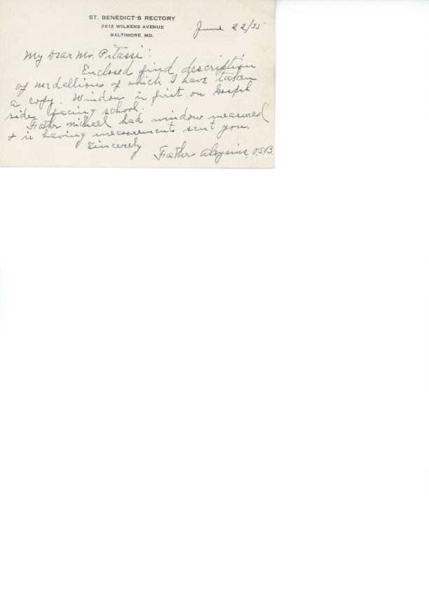 Letter from Aloysius Luther to Leo Pitassi regarding medallions for windows at St. Benedict Church, Baltimore, MD.Collection