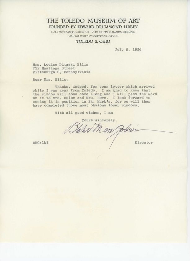 Letter from Blake-More Godwin to Louise Pitassi; St. Mark's Church in Toledo.Collection