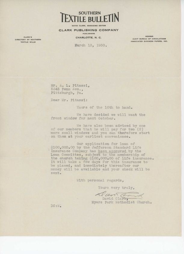 Letter from David Clark to Leo Pitassi expressing Myers Park Methodist Church's desire to acquire Pitassi's glass for the "front" (north) window.Collection