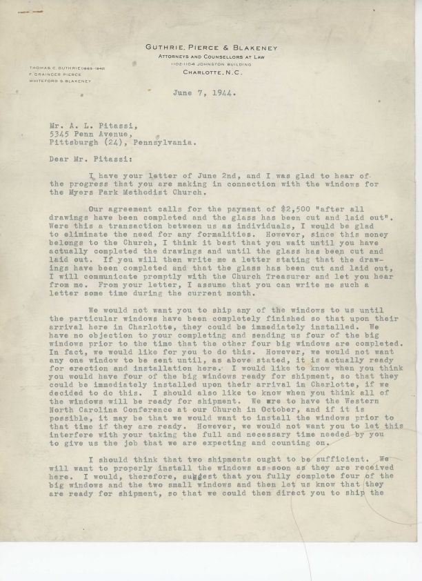 Letter from F. Grainger Pierce to Leo Pitassi regarding upcoming shipments and installation of windows at Myers Park Methodist Church, Charlotte, NC.Collection