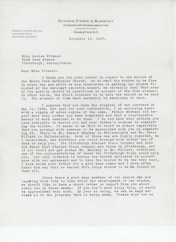 Letter from F. Grainger Pierce to Louise Pitassi regarding the completion of the front/north window at Myers Park Methodist Church, Charlotte, NC.Collection