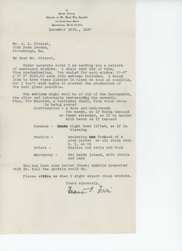 Letter from Francis O. Ferri to Leo Pitassi regarding emblems for windows for Church of St. Paul the Apostle, Spartanburg, SC.Collection