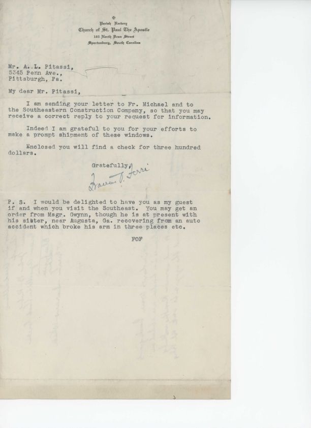 Letter from Francis O. Ferri to Leo Pitassi regarding shipment for windows for Church of St. Paul the Apostle, Spartanburg, SC.Collection
