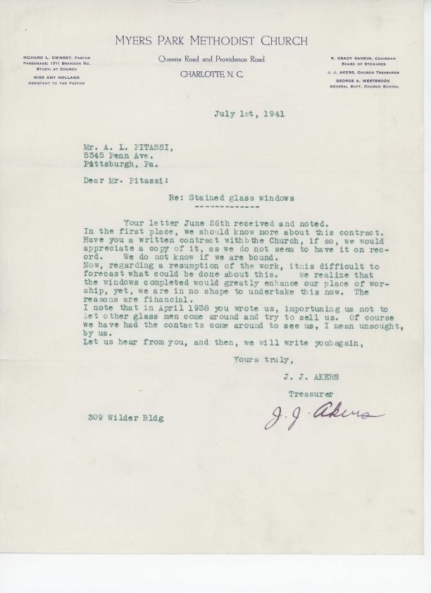Letter from J. J. Akers to Leo Pitassi responding to Pitassi's desire to continue his stained glass contract with the church.Collection