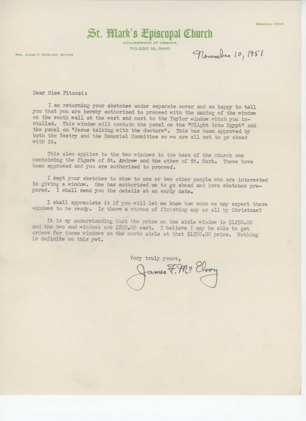 Letter from James F. McElroy to Louise Pitassi authorizing her to begin work on windows at St. Mark's Church, Toledo, OH.Collection