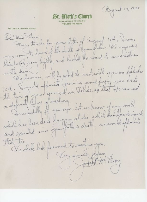 Letter from James F. McElroy to Louise Pitassi expressing his sympathy regarding Leo Pitassi's death and his interest to still acquire stained glass for St. Mark's Church, Toledo, OH.Collection