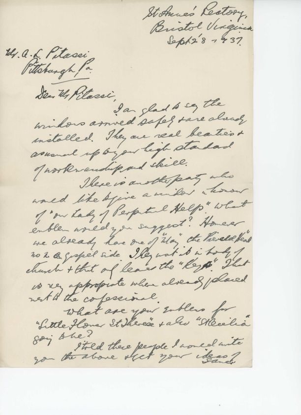 Letter from Rev. James Hickie to Leo Pitassi, acknowledging delivery of the stained glass windows for St. Anne Catholic Church, Bristol, VA.Collection