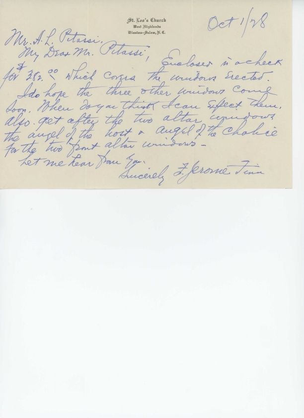 Letter from Jerome Finn to Leo Pitassi regarding an enclosed check and upcoming altar windows at St. Leo's Church in Winston-Salem, NC.Collection