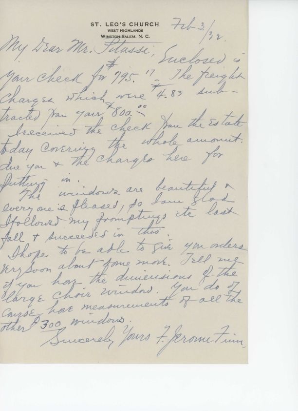Letter from Jerome Finn to Leo Pitassi enclosing a check for windows at St. Leo's Church in Winston-Salem, NC.Collection