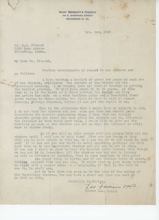 Letter from Leo Frierson to Leo Pitassi regarding future shipment of windows for St. Benedict Church, RIchmond, VA.Collection