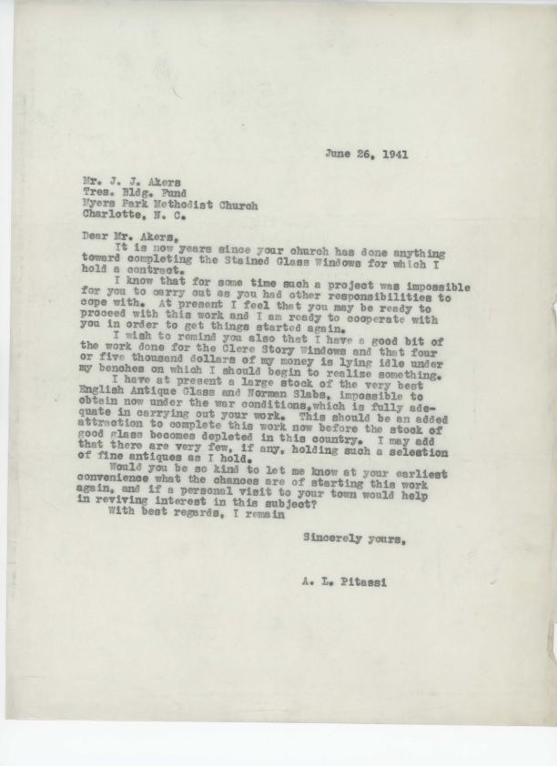 Letter from Leo Pitassi to J. J. Akers regarding Myers Park Methodist Church's lack of action to continue their stained glass contract with Pitassi.Collection