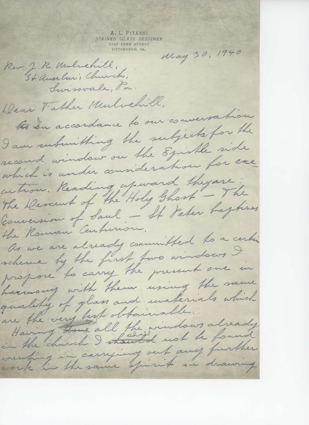 Letter from Leo Pitassi to J. R. Mulvehill regarding subjects for windows at St. Anselm Church, Swissvale, PA.Collection