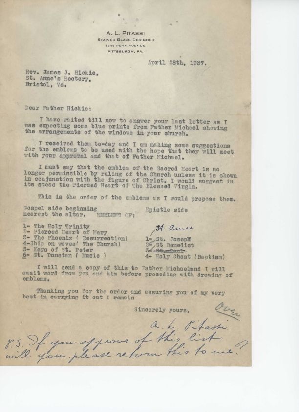 Letter from Leo Pitassi to Rev. James Hickie regarding suggestions for emblem for windows at St. Anne Catholic Church, Bristol, VA.Collection