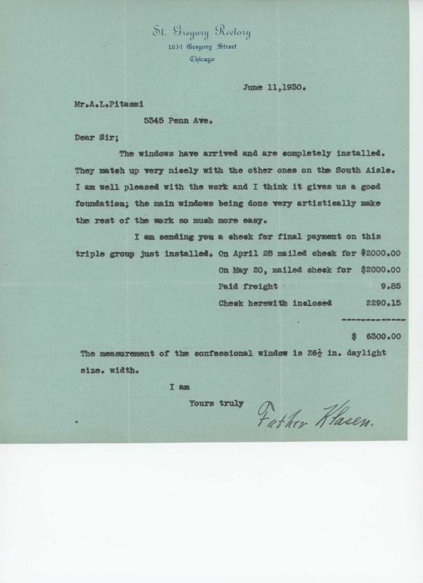 Letter from Michael Klasen to Leo Pitassi regarding installation of new windows.Collection