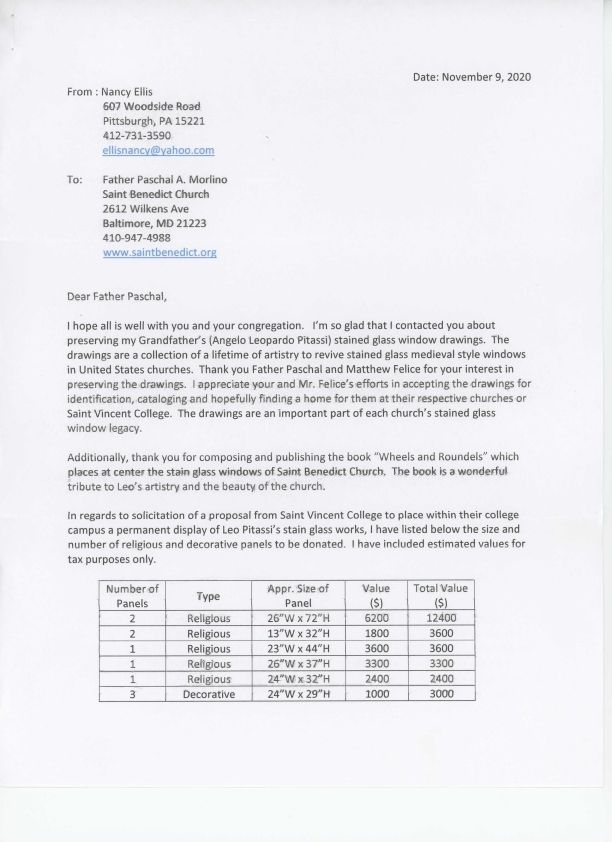 Letter from Nancy Ellis to Paschal A. Morlino regarding donation of Pitassi Stained Glass Studio materials to Saint Vincent College.Collection