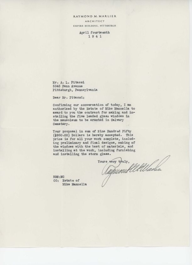 Letter from Raymond M. Marlier to Leo Pitassi awarding Pitassi the contract to create stained glass for the Mike Mannella Mausoleum in Pittsburgh, Pennsylvania.Collection