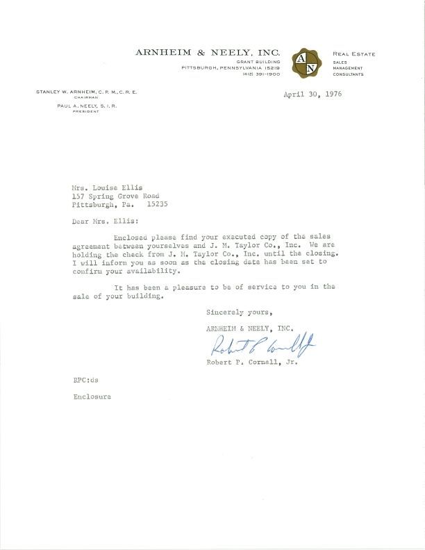 Letter from Robert F. Cornell of Abraham & Neely Inc. to Louise Pitassi Ellis on April 30, 1976 regarding the sale of the Pitassi Stained Glass Studio.Collection
