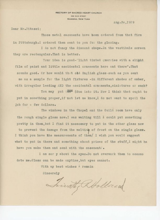 Letter from Timothy R. Holland to Leo Pitassi regarding windows at Sacred Heart Church in Massena, NY.Collection