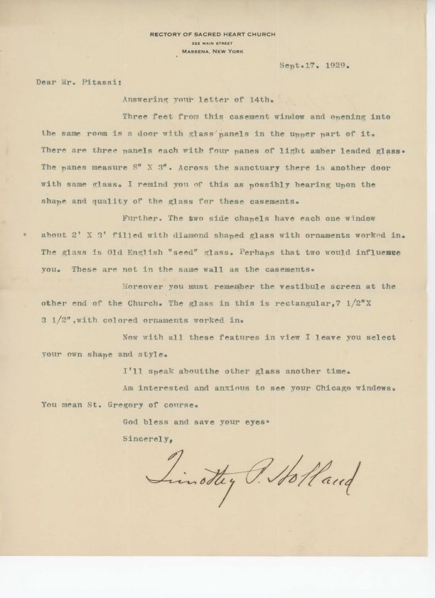 Letter from Timothy R. Holland to Leo Pitassi regarding windows at Sacred Heart Church in Massena, NY.Collection