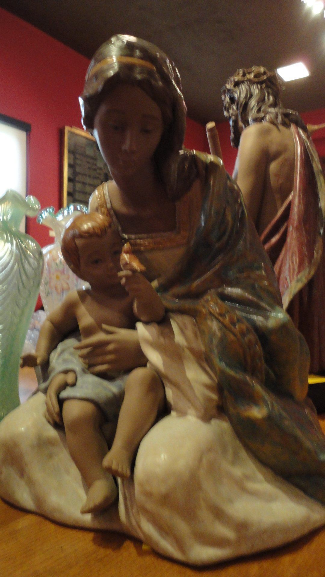 This sculpture depics Mary sitting on the ground holding the Christ Child on her lap.Artwork Details
