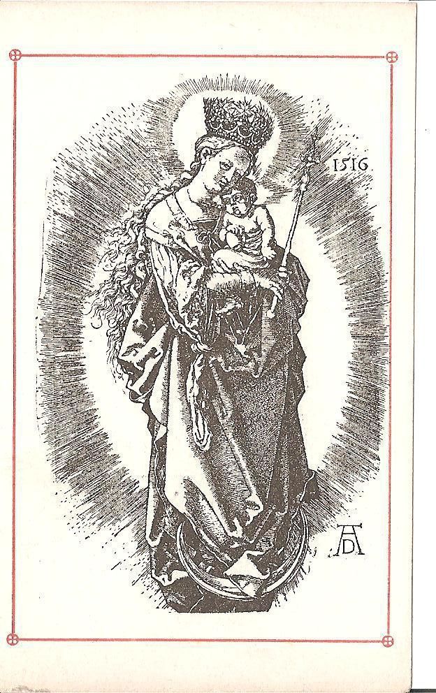 This is a reproduction of a 16th century engraving of Madonna holding baby Jesus as she is looking down. She is portrayed as she is in Revelation, that's why there is a crescent moon underneath her feet. Rays of light are radiating from her and baby Jesus. Mary is also holding a septuor and is wearing a crown. This is 2 out of 4 of the same print.