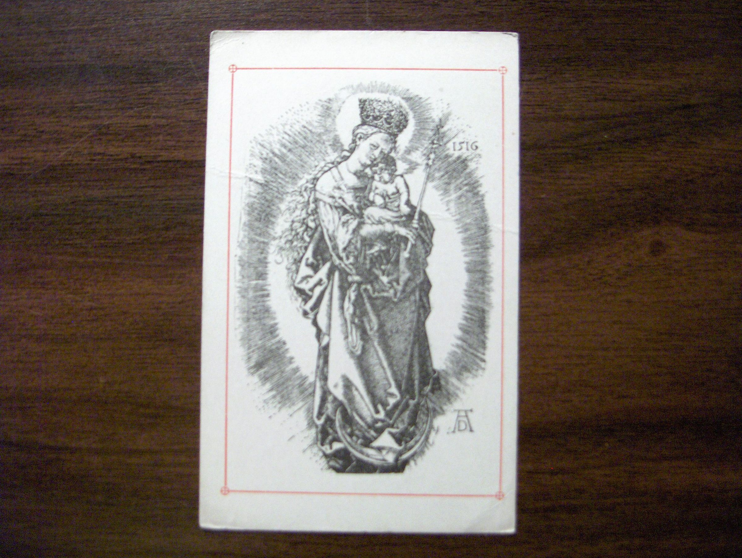 This is a reproduction of a 16th century engraving of Madonna holding baby Jesus as she is looking down. She is portrayed as she is in Revelation, that's why there is a crescent moon underneath her feet. Rays of light are radiating from her and baby Jesus. Mary is also holding a septuor and is wearing a crown. This is 1 out of 4 of the same print.