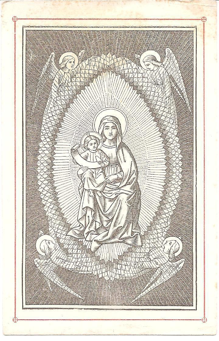 This is a reproduction of a 16th century engraving of Madonna and Child in a mandorla. Mary is holding jesus on her right knee and is encircled by four angels. This is 4 out of 5 of the same print.