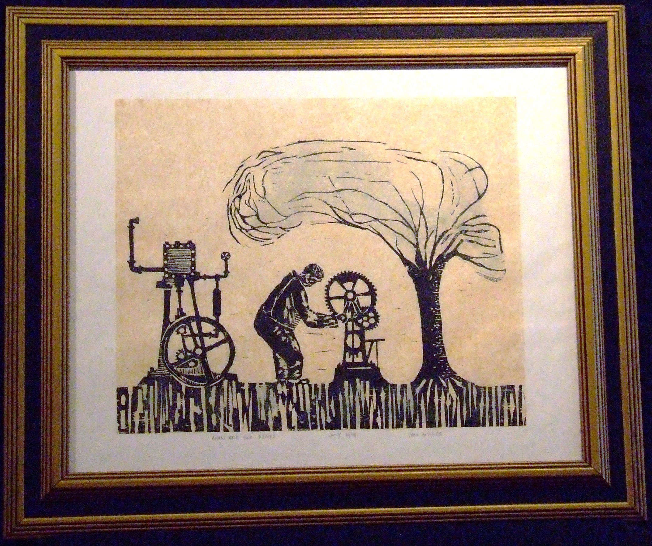 Ink, Paper, Print, Woodcut, Miller, Jim Miller, Miller, Jim, Ink, Paper, Print, Woodcut, Man and Two Pumps, Pumps, Man