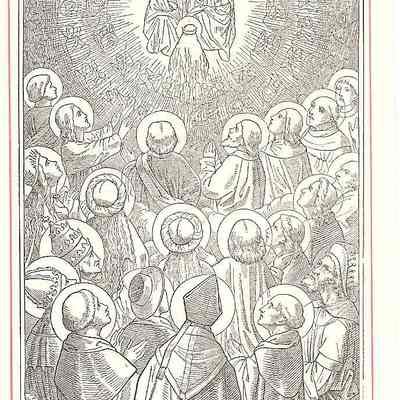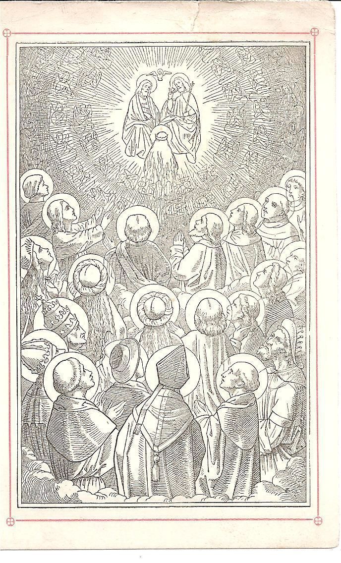 This is a reproduction of a 16th century engraving of the Blessed Virgin Mary being crowned queen of heaven. In the center of the sky surrounded by angels is the Father, Son and the Holy Spirit and before them is Mary who seems to be kneeling and she is wearing a crown on her head. Below that scene are the backs of many holy people such as popes and saints all watching what is going on above them. This is 2 out of 9 of the same print.