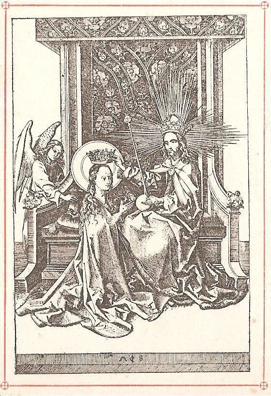 Ink, Paper, Print, Lithograph, Schongauer, Martin, Martin Schongauer, Schongauer, Albrecht Durer, Durer, Albrecht, Durer, Ink, Paper, Print, Lithograph, Prayer Cards, Religious, Religious Subject Matter, Mary, Crowned, Queen, Heaven, Throne, Angel