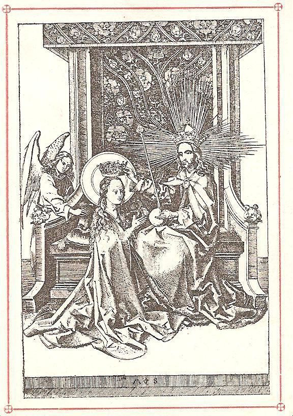 Ink, Paper, Print, Lithograph, Schongauer, Martin, Martin Schongauer, Schongauer, Albrecht Durer, Durer, Albrecht, Durer, Ink, Paper, Print, Lithograph, Prayer Cards, Religious, Religious Subject Matter, Mary, Crowned, Queen, Heaven, Throne, Angel