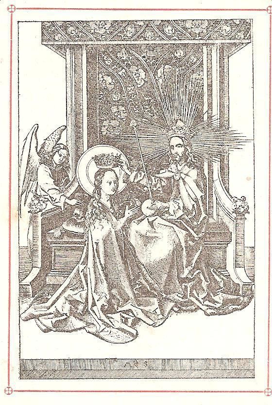 Ink, Paper, Print, Lithograph, Schongauer, Martin, Martin Schongauer, Schongauer, Albrecht Durer, Durer, Albrecht, Durer, Ink, Paper, Print, Lithograph, Prayer Cards, Religious, Religious Subject Matter, Mary, Crowned, Queen, Heaven, Throne, Angel