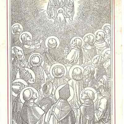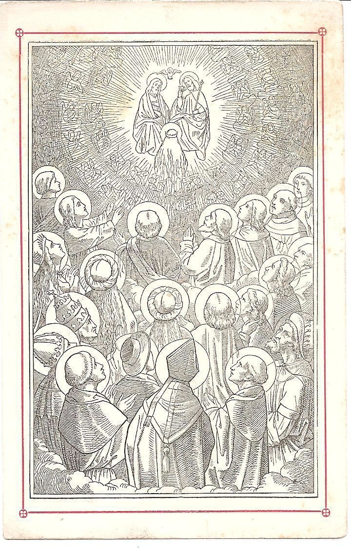 This is a reproduction of a 16th century engraving of the Blessed Virgin Mary being crowned queen of heaven. In the center of the sky surrounded by angels is the Father, Son and the Holy Spirit and before them is Mary who seems to be kneeling and she is wearing a crown on her head. Below that scene are the backs of many holy people such as popes and saints all watching what is going on above them. This is 7 out of 9 of the same print.