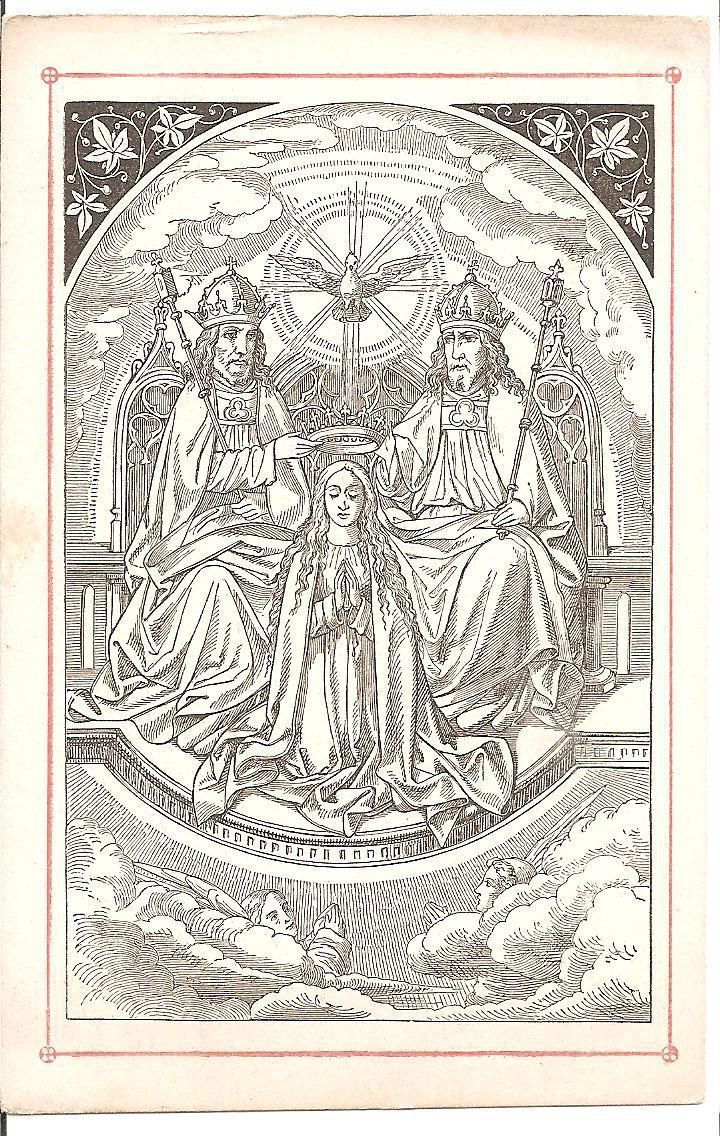 This is a reproduction of a 16th century engraving Mary being crowned Queen of heaven by the Holy Trinity. Mary is in the center kneeling while the Father and the Son are crowning her and the Holy Spirit is above her. There are two angels at the bottom in the clouds who are praying. This is 2 out of 2 of the same print.