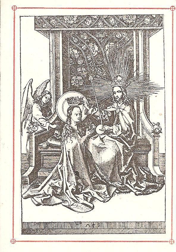 Ink, Paper, Print, Lithograph, Schongauer, Martin, Martin Schongauer, Schongauer, Albrecht Durer, Durer, Albrecht, Durer, Ink, Paper, Print, Lithograph, Prayer Cards, Religious, Religious Subject Matter, Mary, Crowned, Queen, Heaven, Throne, Angel