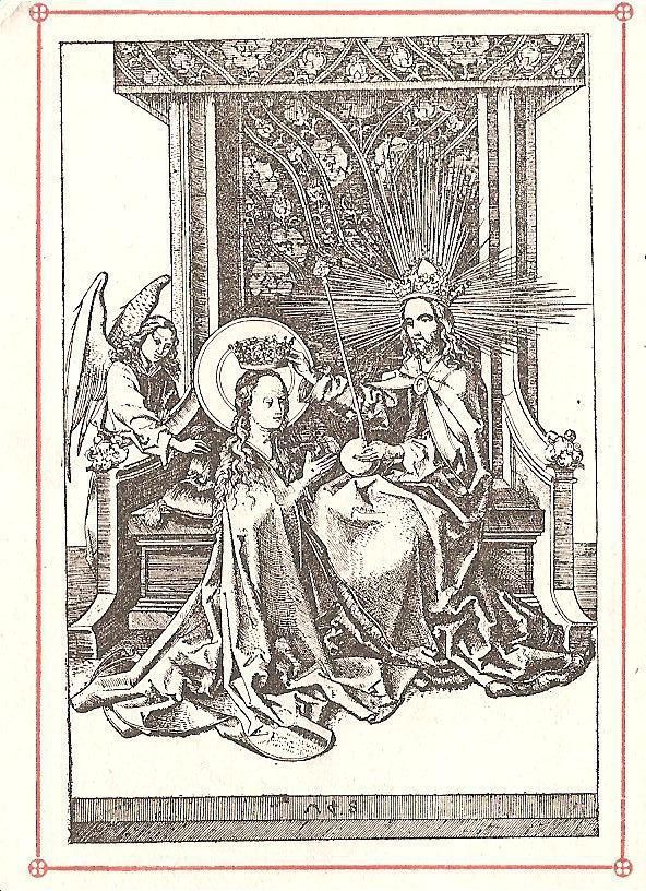 Ink, Paper, Print, Lithograph, Schongauer, Martin, Martin Schongauer, Schongauer, Albrecht Durer, Durer, Albrecht, Durer, Ink, Paper, Print, Lithograph, Prayer Cards, Religious, Religious Subject Matter, Mary, Crowned, Queen, Heaven, Throne, Angel