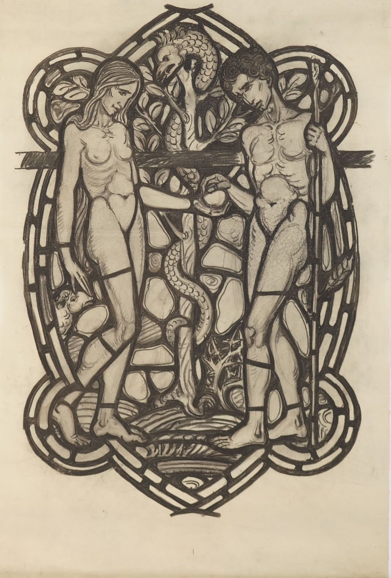 Stained glass scale cartoon, in St. Peter Catholic Church, Massena, NY. Medallion for an aisle window. Depicts Adam and Eve eating from the Tree of Knowledge of Good and Evil. The serpent is on the Tree between them. Eve bears an apple, and Adam bears a staff.Type of Drawing