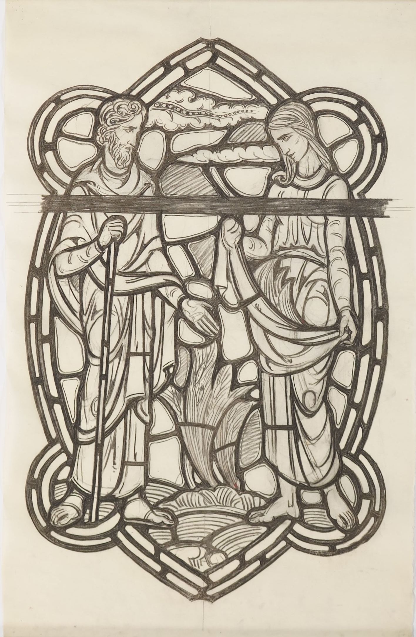Stained glass scale cartoon, in St. Peter Catholic Church, Massena, NY. Medallion for an aisle window. Depicts Boaz speaking to Ruth as she gleans the field, alluding to Ruth 2.Type of Drawing