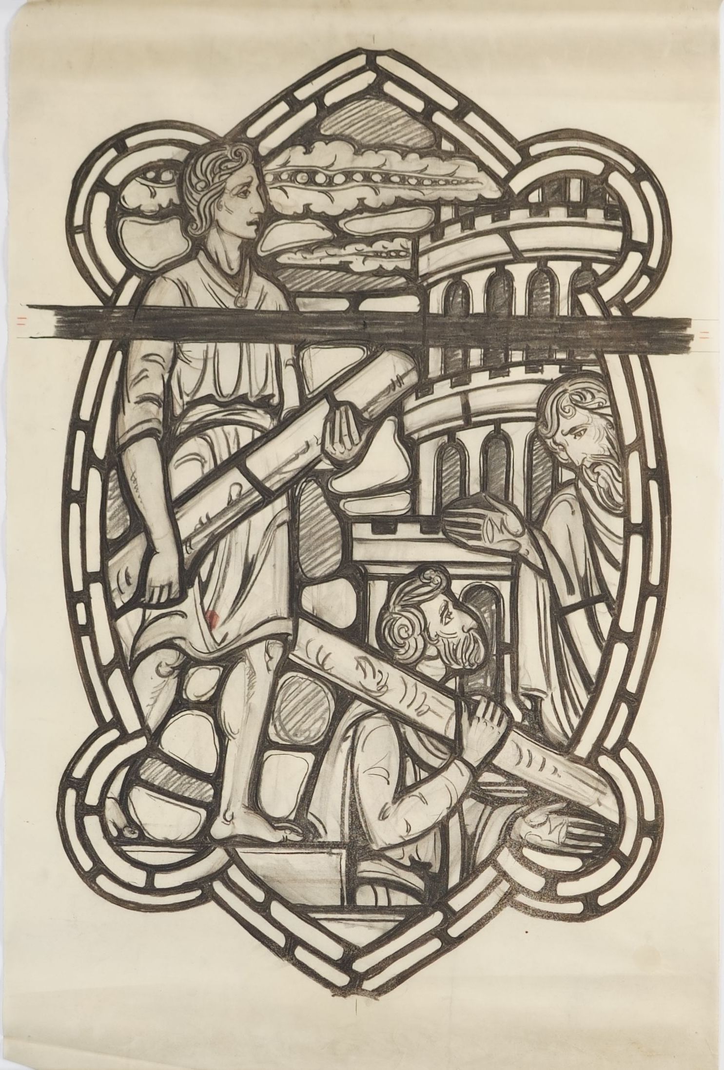 Stained glass scale cartoon, in St. Peter Catholic Church, Massena, NY. Medallion for an aisle window. Depicts the construction of the Tower of Babel. Two men are carrying wood or beams and another man is talking to them.Type of Drawing