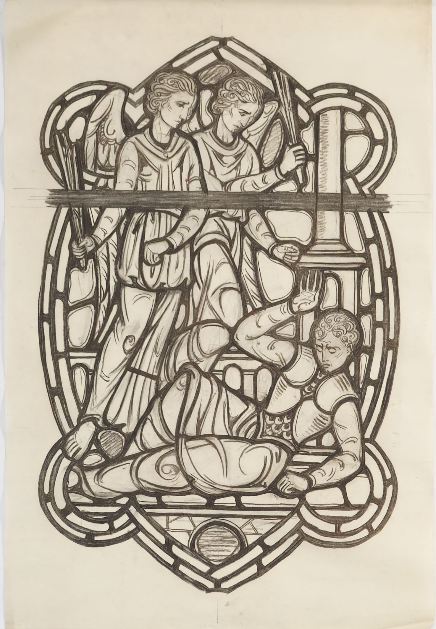 Stained glass scale cartoon, in St. Peter Catholic Church, Massena, NY. Medallion for an aisle window. Depicts two angles threatening a man on the ground. Possibly an allusion to Jacob wrestling with the angel (Genesis 32) or Lot and the two angels (Genesis 19).Type of Drawing
