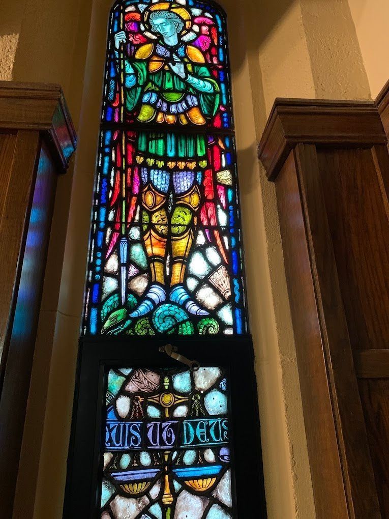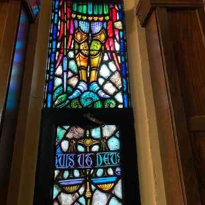 Stained glass scale cartoon, lower portion/ventilator of St. Michael the Archangel window (2021.1.578) in Sacred Heart Church in Massena, New York. Depicts scales and the words "QUIS UT DEUS" ("Who is like God?").Type of Drawing