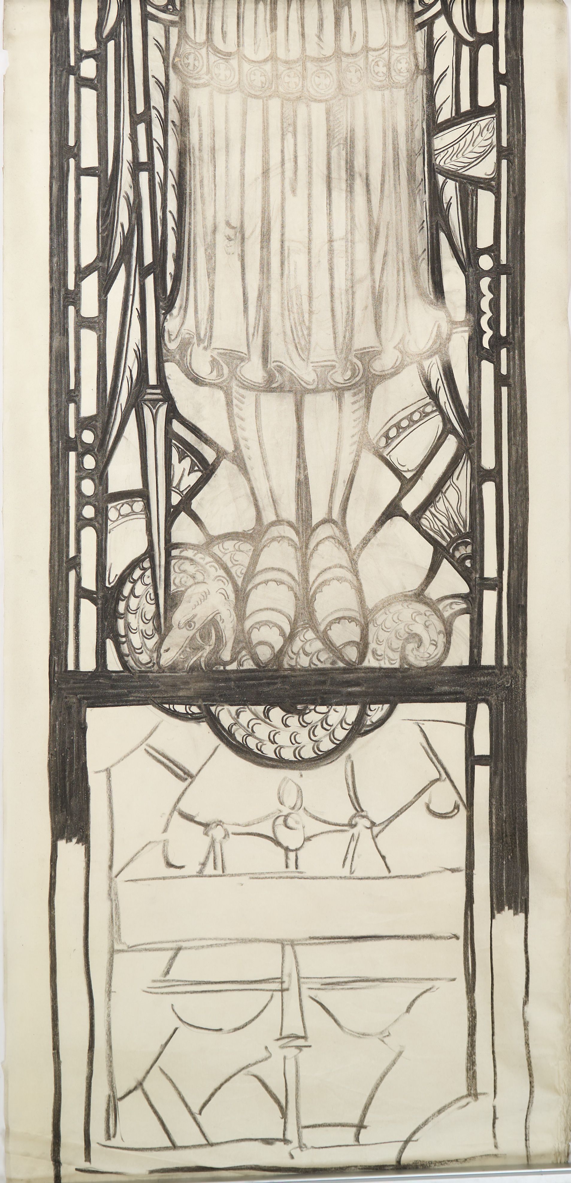 Stained glass scale cartoon, draft for lower portion of a window in Sacred Heart Church in Massena, New York. Depicts St. Michael the Archangel killing a snake with a sword.Type of Drawing