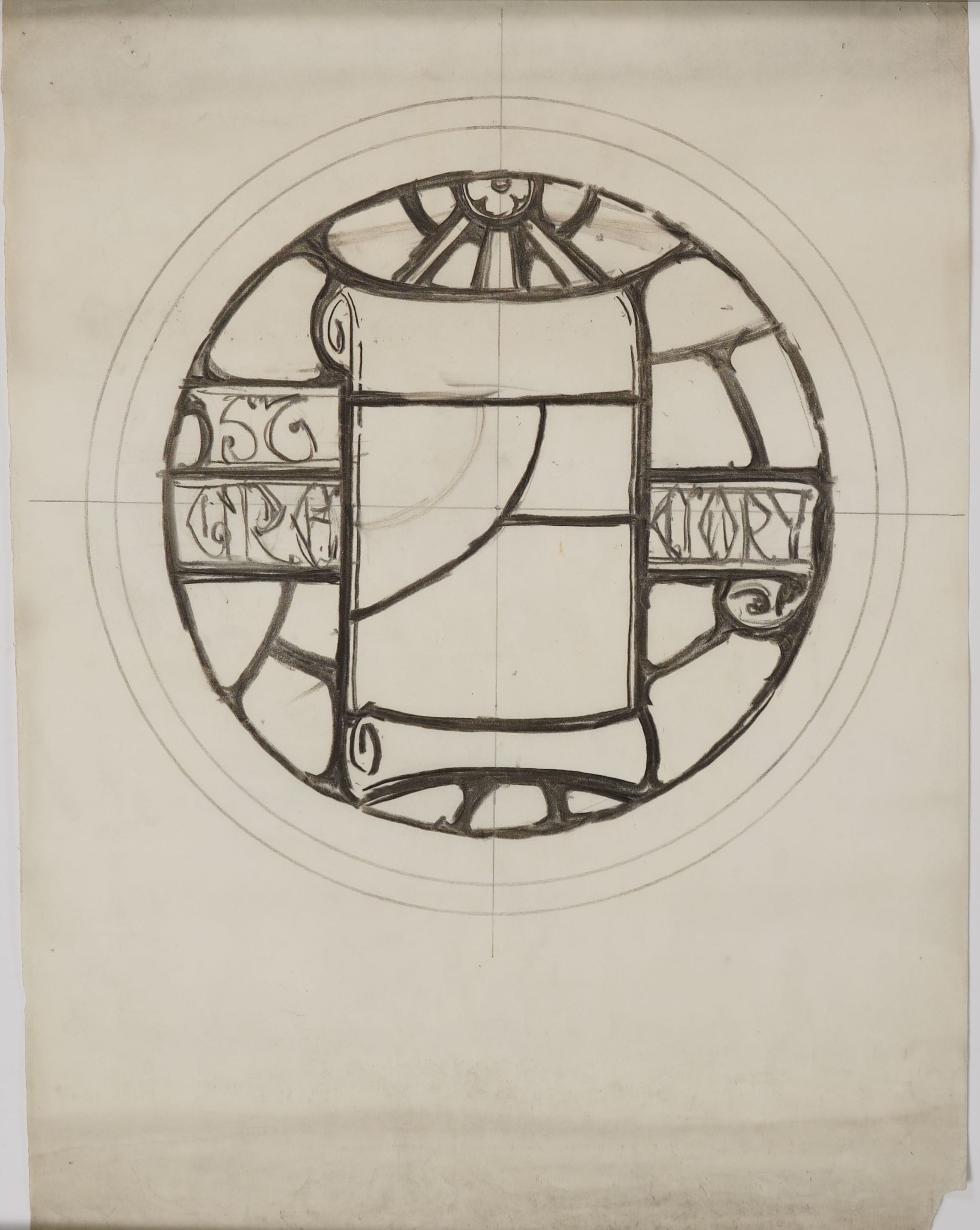 Stained Glass scale cartoon, possibly for St. Mark's Catholic Church, McKees Rocks Bottoms, Pittsburgh, PA. Depicts a scroll. "St. Gregory" is written across the drawing.Type of Drawing