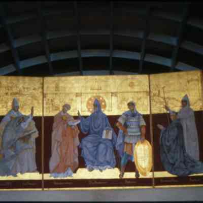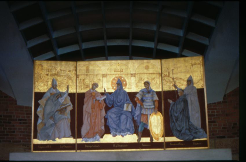 This is the centerpiece of the Crypt rededication spearheaded by Fr. Quintn Schaut, O.S.B. of the redecoration of the Basilica Crypt in 1946 for the 100th anniversary of the arrival of the Benedictines in America.Artwork Details