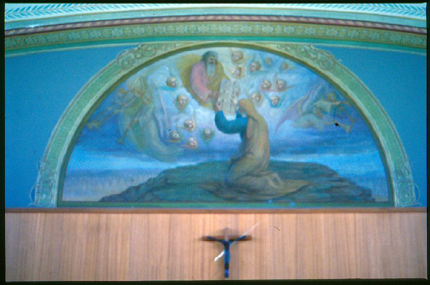 This false fresco depicts Moses recieving the law from God. It was painted over with oil paint in the 1950s and had some treatment in 1996 during the Refectory renovation.Artwork Details