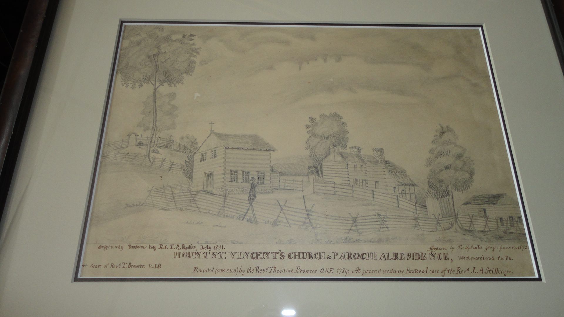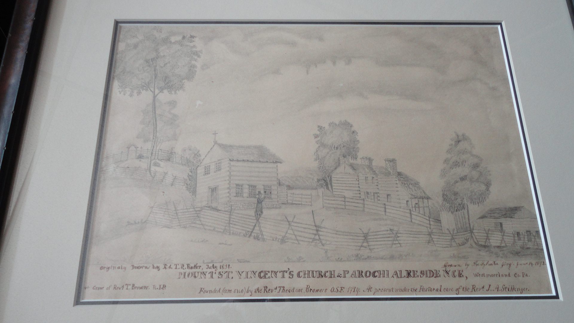 The drawing shows the original buildings built on the site sometime before 1833-when the parish began building a brick church, which was dedicated in 1835. According to Fr. Sylvester Jörg's notations on this drawing it is after one by Ted. T. R. Budler, and made in July, 1831. The Jörg drawing also mentions Rev. J. A. Stillinger, who was pastor at Saint Vincent from 1830 to 1844, and responsible for building the brick church. He was the last resident pastor until the arrival of Boniface Wimmer, O.S.B., and the Benedictines, in 1846.