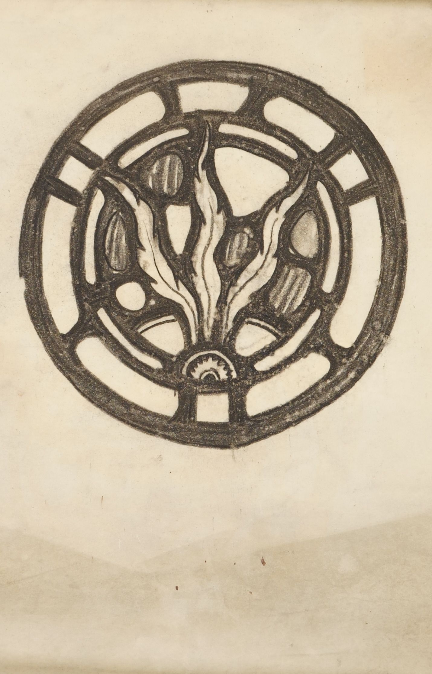 Stained glass scale cartoon, roundel for window at St. Bernard Church, Mt. Lebanon, PA. Depicts three flames.Type of Drawing