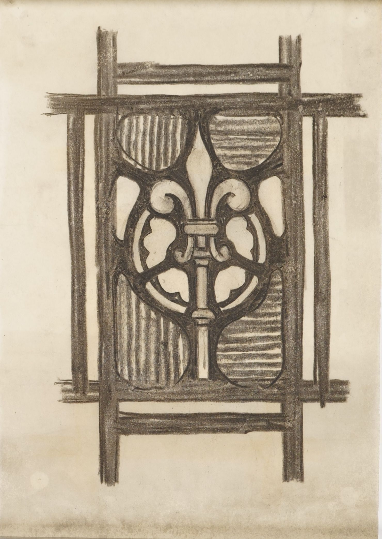 Stained glass scale cartoon, symbol for window at St. Bernard Church, Mt. Lebanon, PA. Depicts a staff with a fleur-de-lis on top of it.Type of Drawing