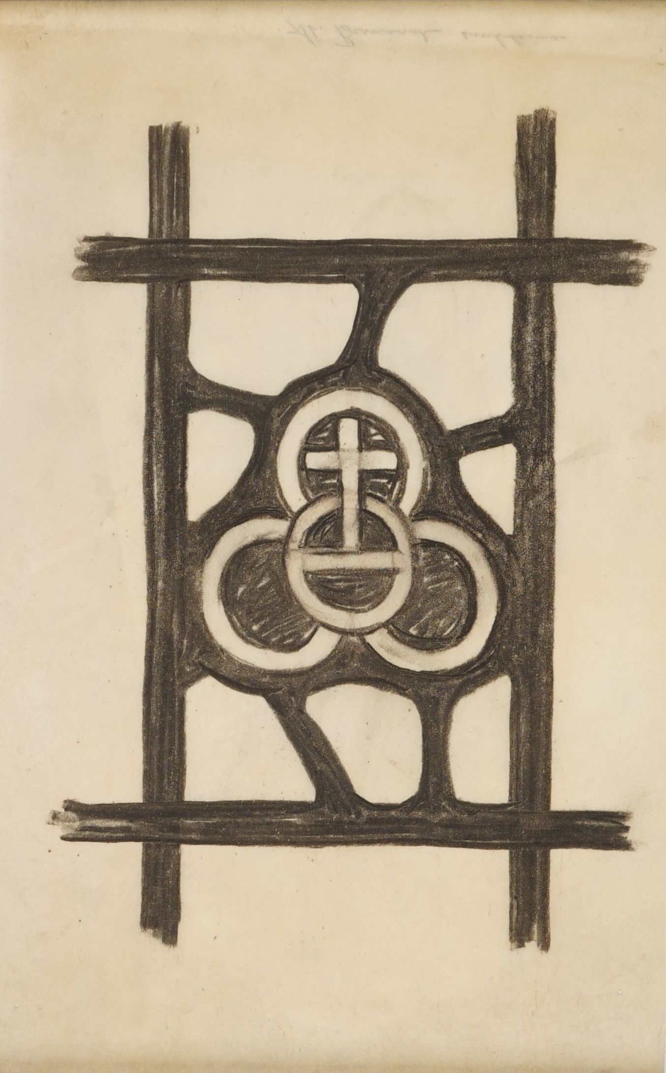 Stained glass scale cartoon, symbol for window at St. Bernard Church, Mt. Lebanon, PA. Depicts a trinity represented by three circles with an orb in the center.Type of Drawing