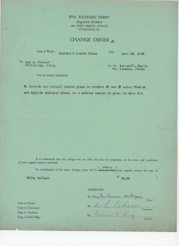 Change Order from June 15, 1934 instructing Pitassi to furnish and install stained glass for two windows at St. Bernard Church.Collection